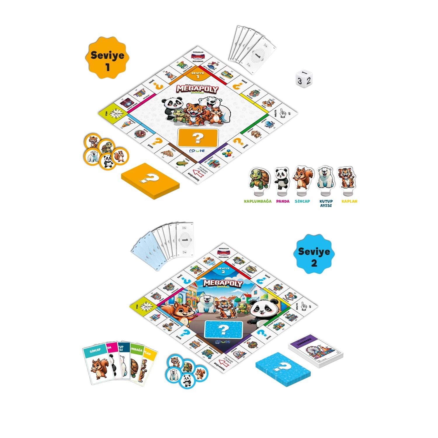 İÇİNDEKİLER • Çift Taraflı Oyun Alanı • 5 Junior Piyonu • 5 Karakter Kartı • 16 Tapu Senedi • 17 Seviye 1 Şans Kartı • 17 Seviye 2 Şans Kartı • 60 “Satıldı” Tabelası (her piyon için 12 adet) • 1 Zar • Para Destesi (90 birlik, 90 beşlik)